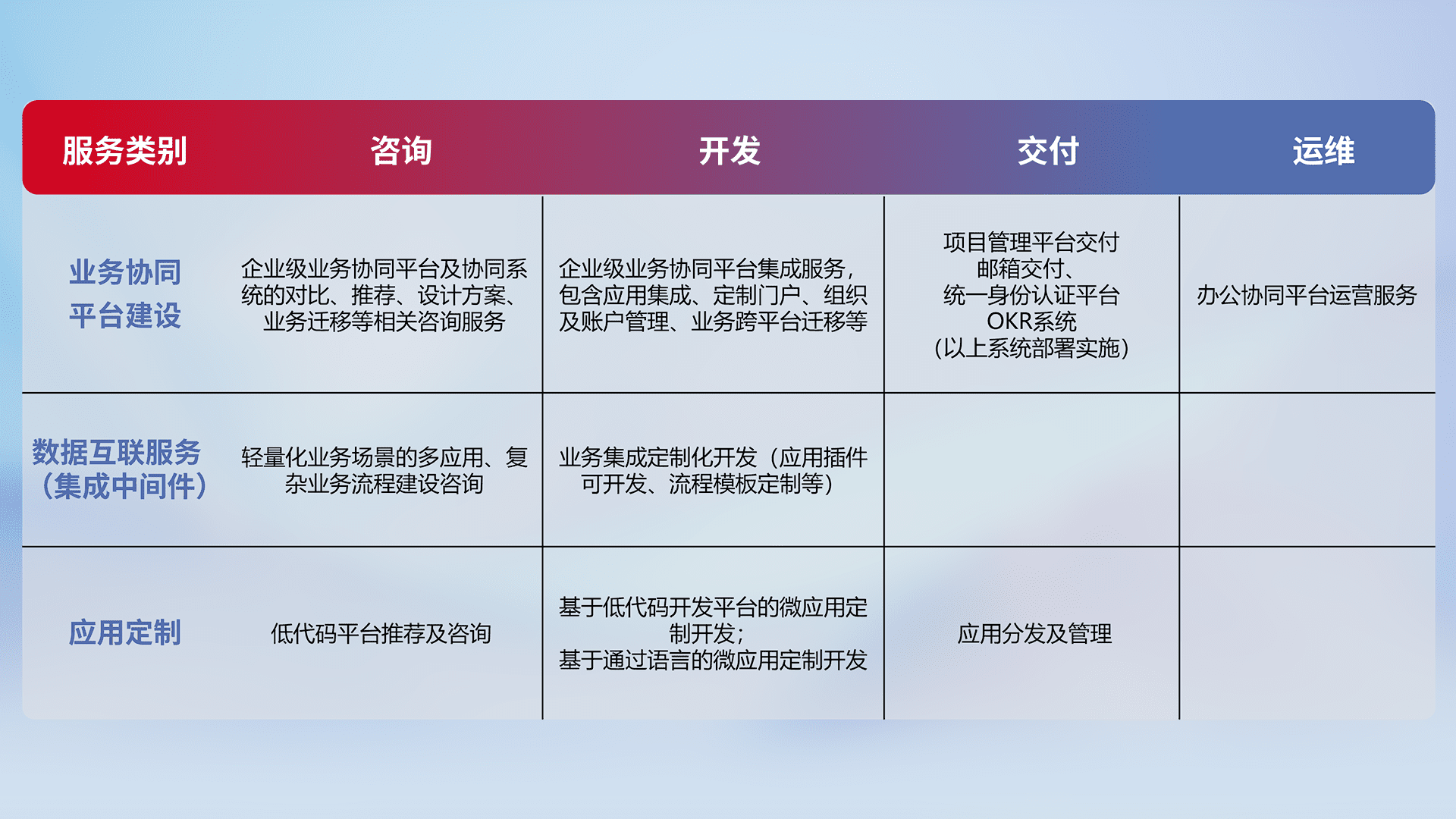 针对钉钉、、、企微、、IDaas等平台级产品提供产品的规划、、方案、、、交付、、、、定制化开发等服务,,,实现如统一协同办公、、智能客户服务、、、混合会议管理、、、智能数据查询、、、、等业务场景,,,实现数字化转型。。。